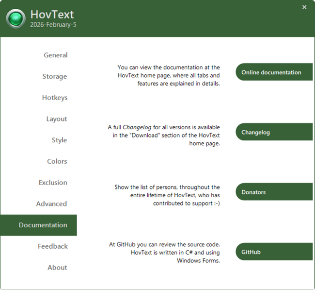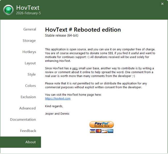 As any other developers, doing this in our spare time, then we of course could hope for a "fair use", which means that if you like HovText and you use it, then we would naturally appreciate a donation for whatever amount you find reasonable and fair. This would for sure motivate for continues support, if we see this is a tool that actually is used and liked by others. Use the Donate link in the left side menu, if you want to support. Donations received will go to continues support for HovText - e.g. a code signing certificate, new graphic, UI frameworks and who knows. We did not make HovText to earn profit from it and both of us have good jobs in the IT industry, which is lucky for us as HovText will never be a golden goose - just view the Donators page, to put things in perspective.